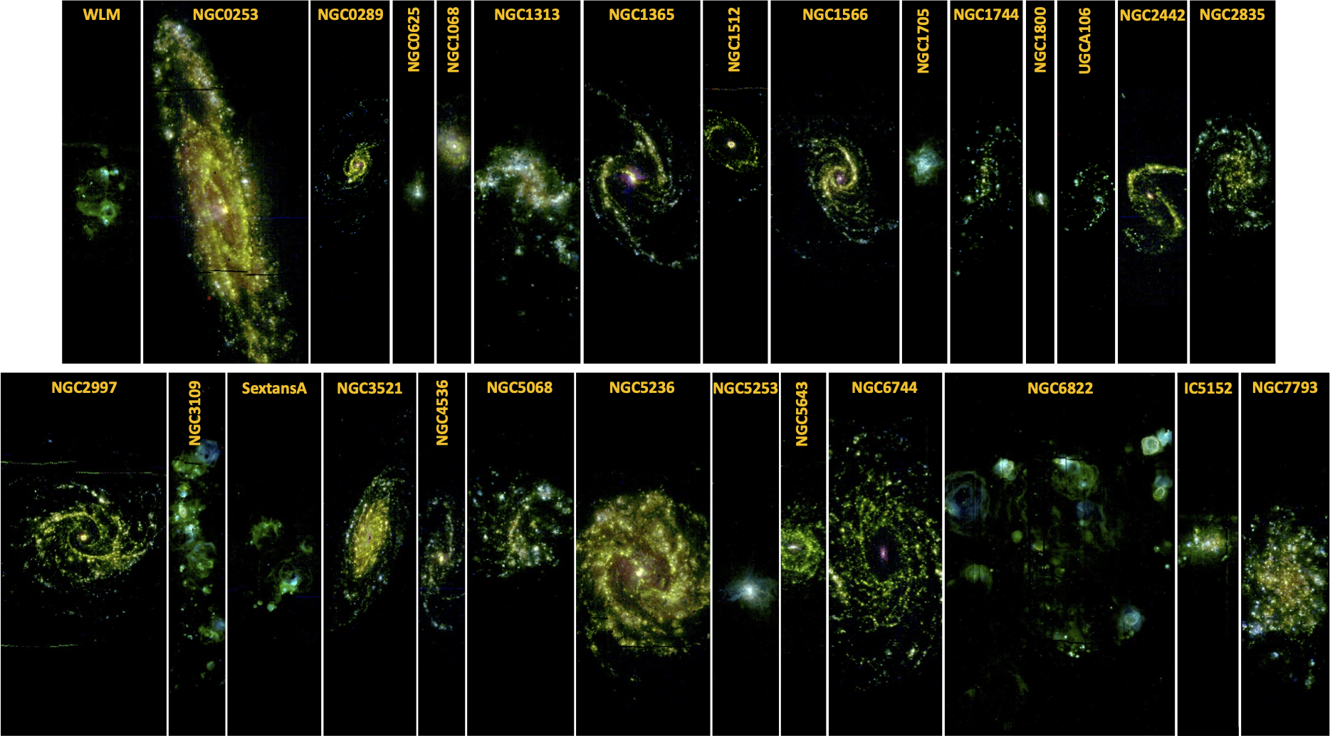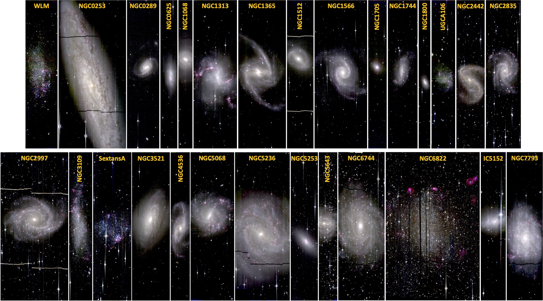 List of 44 galaxies in the TYPHOON Survey. The sample spans a wide range in morphological types from dwarf irregulars (e.g., WLM, Sextans A), AGN/Seyferts (e.g., NGC1068, NGC1365), large spirals (e.g., NGC5236, NGC7793), and ring galaxies (e.g., ESO350-G040, ESO034-IG011). Coordinates (RA/Dec), morphological type, and distances (Mpc) are taken from the NASA/IPAC Extragalactic Database.
